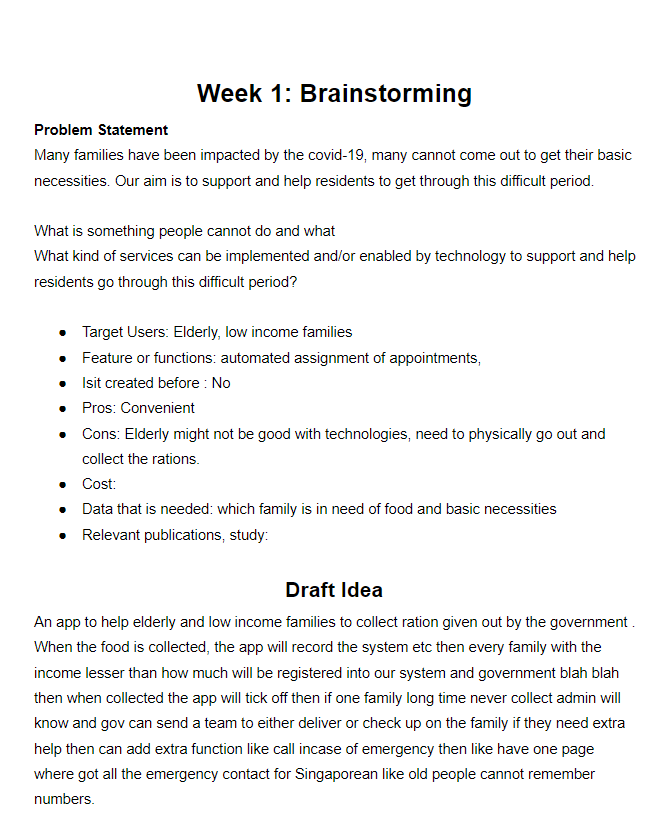 We did most of our brainstorming through Google Docs, where we pinpoint problems and research to find out the needs of elderly and low-income families. This will help us to decide on our features that we can implement in our mobile app. Throughout the process, we tried to create something unique.